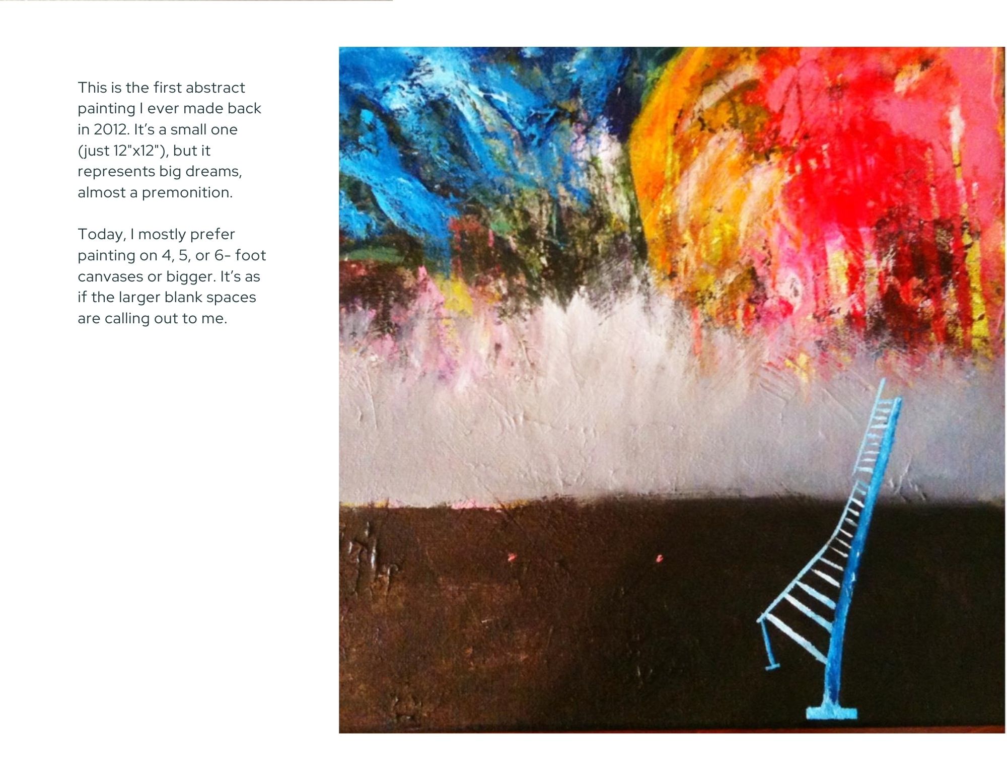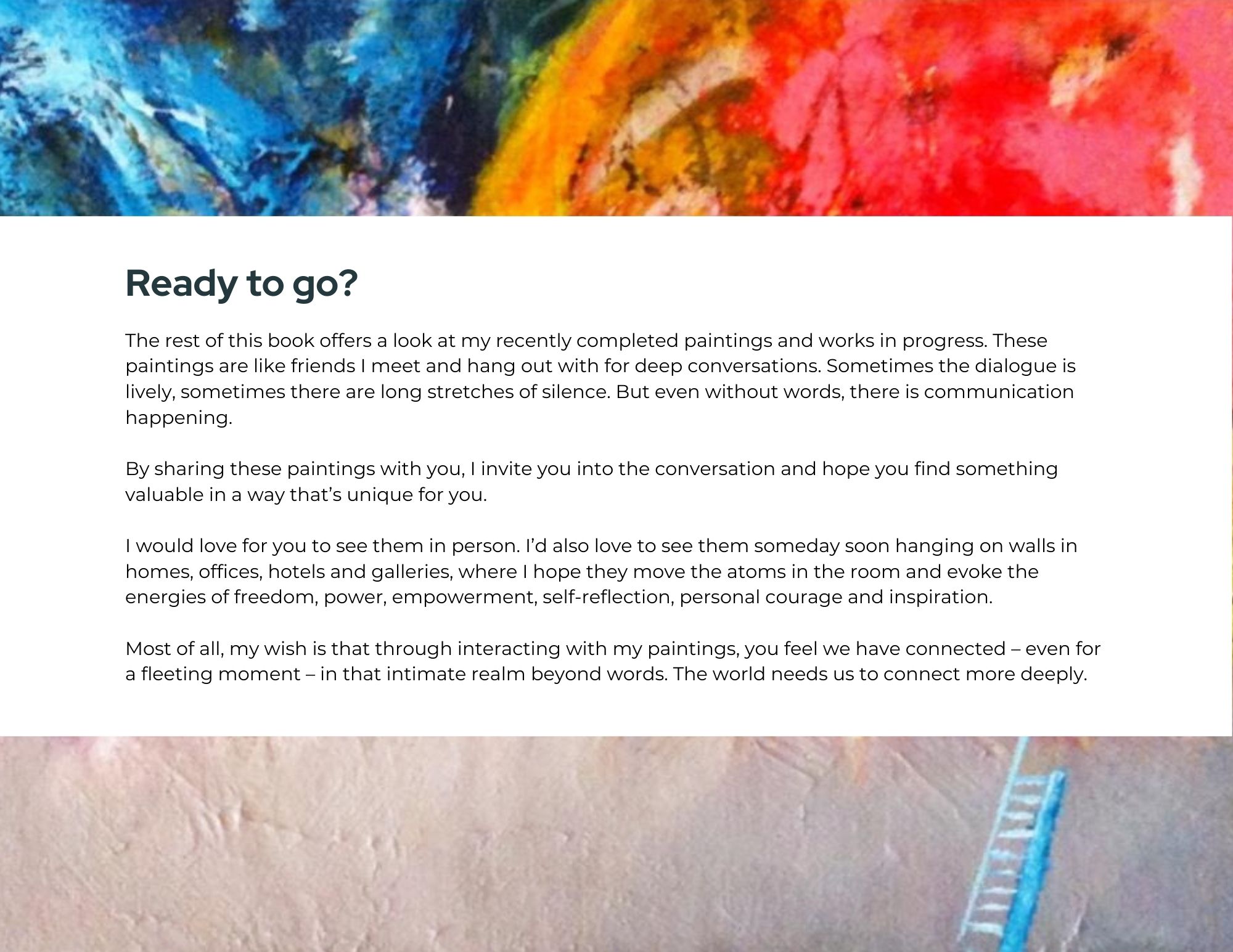 This book is a work in process. In it, I offer insights into my journey as an artist, why I paint, behind-the-scenes in my studio with close-ups and progress photos of my paintings, and what I hope to cultivate through my art.